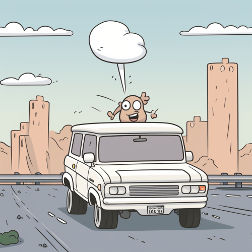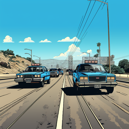 1990's style police cars with sirens and lights on, driving on the freeway in los angeles. Blue sky on a sunny day. Front of car view. simple 2d comic style illustration.