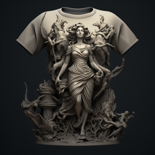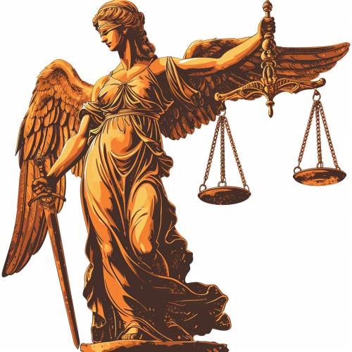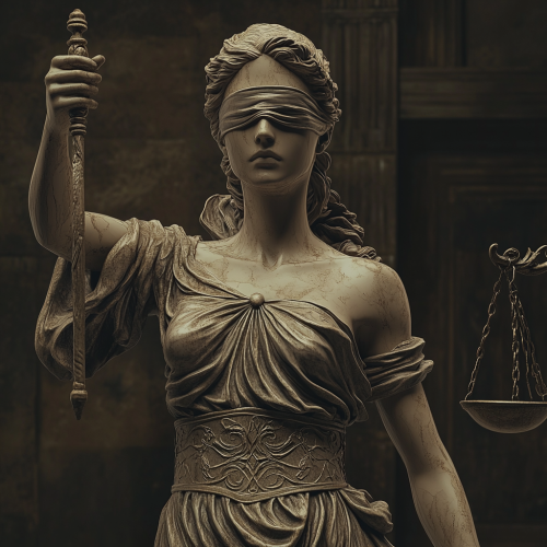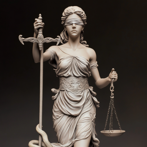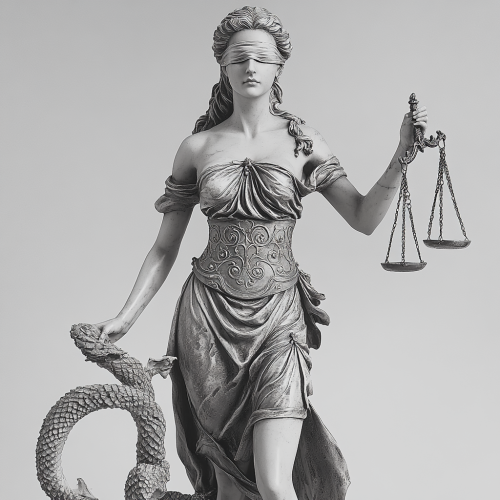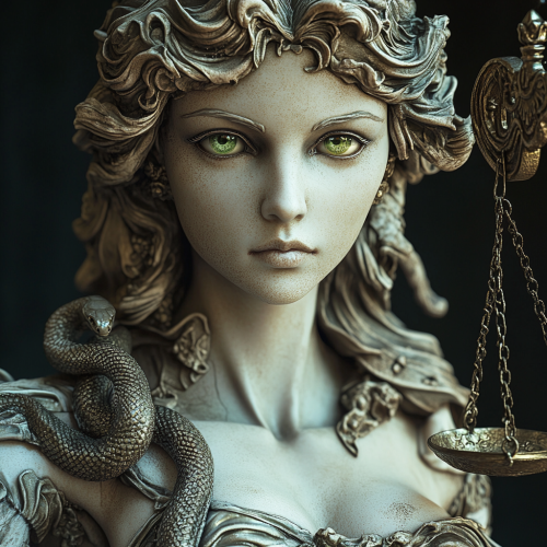 She is a statue of Lady Justice with a very beautiful face. The details are so intricate that it looks like a real photograph. She is facing the camera directly. She is wearing a silk dress that partially covers her chest. She has long hair, and each of her ears is adorned with a feather. She has one leg extended, with a snake wrapped around it. In one of her hands, she is holding a scale.