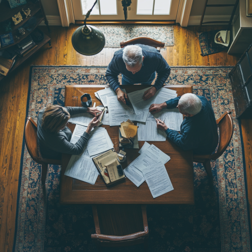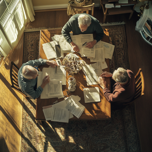an overhead shot of a well-lit dining room table with an elderly man and a couple in their 40s, looking over a pile of legal papers and bills. Use a Canon EOS 5D Mark IV camera equipped with a Canon EF 50mm f/1.2L USM lens. --v 6.1