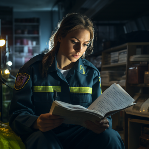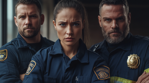 a firefighter, a police officer and an emt standing together close with arms folded. looking into the camera seriously. shot is medium close hyper realistic --ar 16:9 --v 6.1