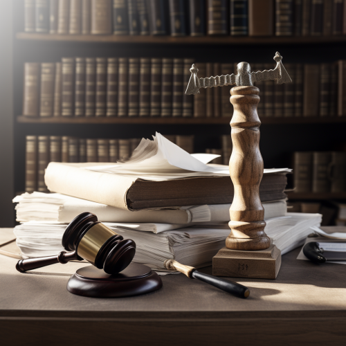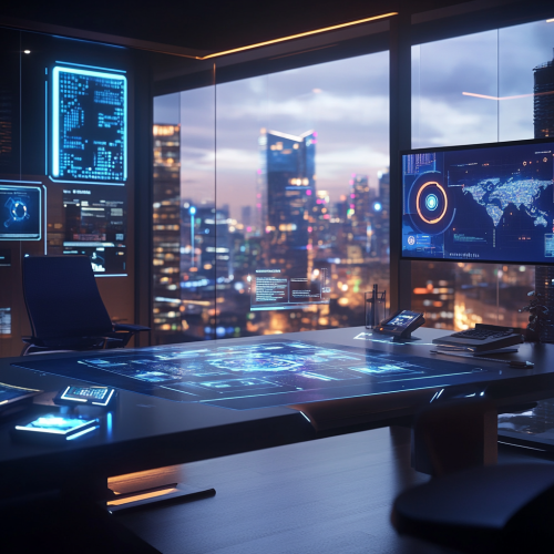 Image of a lawyer's desk with a holographic interface projecting legal documents and AI assistants offering insights. The room could have a futuristic design with digital screens and a modern cityscape visible through a window.