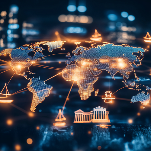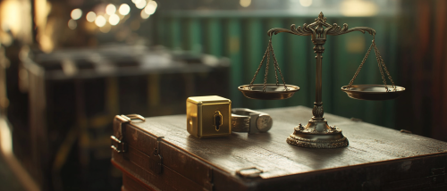 a lawyers scale inside a lawyers office, in the blurred background yo can see a mexican party, in one plate of the scale it's a maritime container and in the otrher plate it´s a golden lock, excelents photoshoot lightning, --ar 7:3