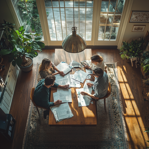 an overhead shot of a modern, well-lit dining room table in an oversized dining room. There are three people in their 40s sitting at the table. They're looking over a pile of legal papers and bills. Use a Canon EOS 5D Mark IV camera equipped with a Canon EF 50mm f/1.2L USM lens. --v 6.1