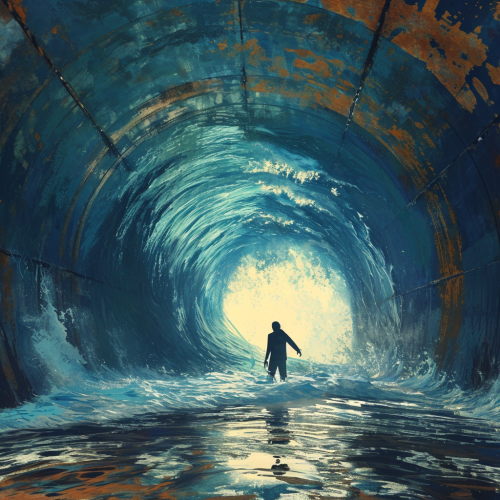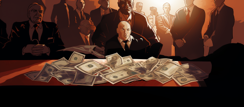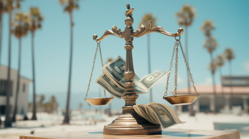 the scales of justice holding overflowing cash standing on Venice beach, hot day, palm trees, cinematic, realistic, 8K --ar 16:9