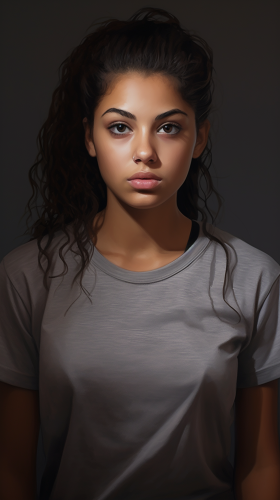 American 18 year old young woman wearing a gray t-shirt, in police custody, --ar 9:16