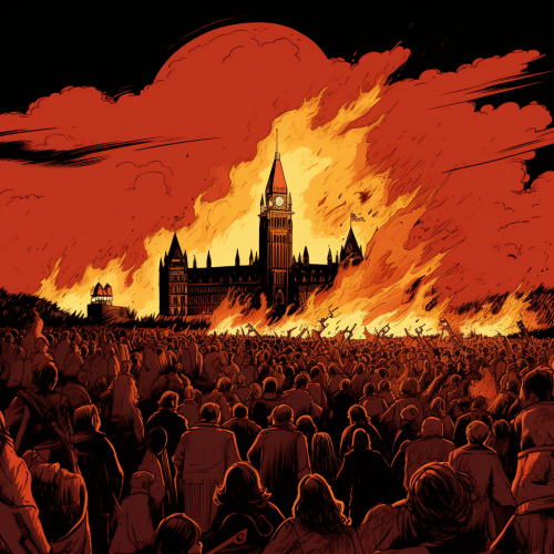 editorial style cartoon showing the Canadian Constitution in flames on parliament hill in Ottawa