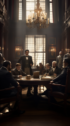 19th century lawyers and judges, in a cort room, hyper realistic, cinematic, 8k, --ar 9:16