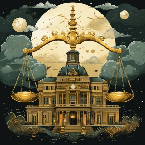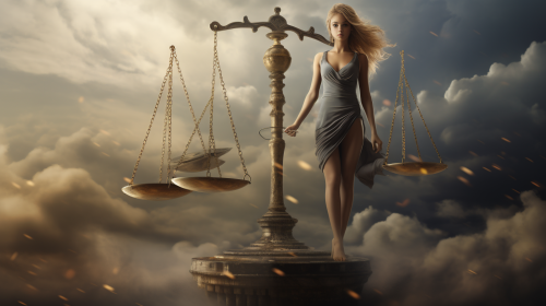 a legal odyssey in a very etheareal place in the clouds. a woman wearing a blindfold holding the scales of justice. --ar 16:9