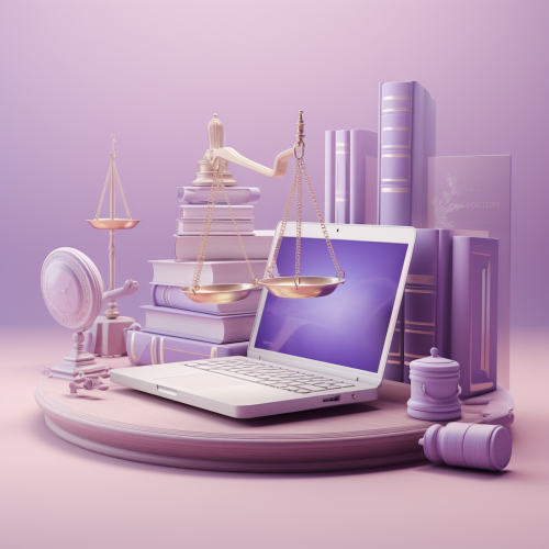 AI Legal Assistant Desk Setting: Personalized office desk. Main Element: Desktop with a chatbot interface, signaling interaction with the AI. Color Palette: Bright whites, uplifting oranges, and comforting blues. Style: Minimalistic, vibrant, and user-friendly. Miscellaneous Elements: Note pads with justice scale doodles, a coffee mug with a gavel design, or mousepads in the shape of legal books. Overall Feel: The ease of having a handy AI legal assistant right at your desk.
