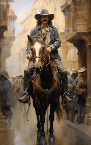 a full portrait of the lawman pat garrett on horse coming slowly down the. main street so wed can see his face clearly. done in style o G Harvey --ar 10:16