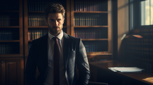 a 28 years old lawyer, starting his own law company, in a small office, uellow details, dark colors, cinematic bokeh, shoot at 35mm, full body shot, --ar 16:9