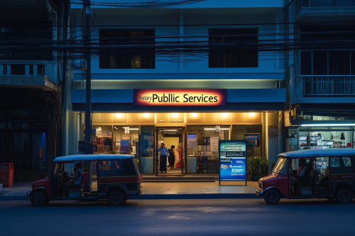 Design a wide image that captures the exterior of a notary public office in Thailand. The building should have a modern design with clear signage indicating "Notary Public Services" in both English and Thai. Include a few people entering the building, and perhaps a Thai lawyer or notary in traditional attire standing at the entrance, greeting clients. The background should feature typical Thai urban elements, like tuk-tuks or street vendors, to set the scene --ar 3:2 --v 6.1