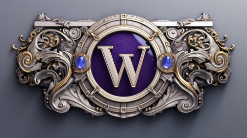 A stylized CGI rendering of the capital letter "W". The letter "W" is sturdy and bold, seemingly crafted from gold and silver. The letter "W" is affixed to an escutcheon of moderate adornment which is crafted of silver and whose edges are trimmed in gold. The escutcheon is ornamented with amethyst and lapis lazuli. Flat white background, no shadow. --ar 16:9
