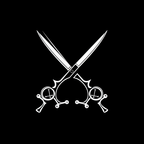 Logo, 2D vector, One Piece-inspired barbershop, stylized scissors and straight razor crossed like pirate swords, bold black and white, adventurous design. --v 6.0