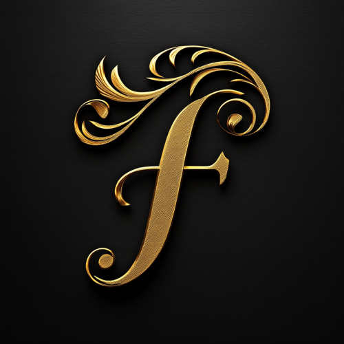 Create a stylized calligraphic icon of the letter 'F', blending elegant curves and sharp edges. The style should evoke classic calligraphy with ornate flourishes, a delicate balance of bold strokes and intricate detailing. Use a black and gold color scheme for a luxurious feel, with subtle shading to emphasize the depth of the lines. The design should feel timeless and regal, perfect for a refined, modern logo