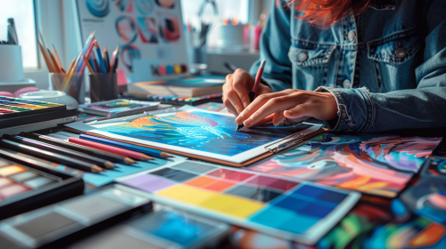 Create a visually striking image that symbolizes branding. Show a central logo being constructed or evolving, surrounded by vibrant color palettes, typography samples, and abstract shapes representing creativity and design. Use clean lines, geometric patterns, and modern, futuristic elements to represent the process of building a brand identity. Include subtle textures like metallic gradients, glowing effects, and layered elements to convey the depth and intricacy of branding. The overall composition should evoke innovation, professionalism, and the blending of art and technology.