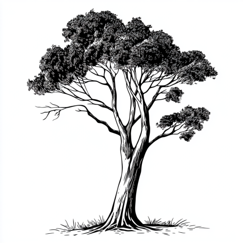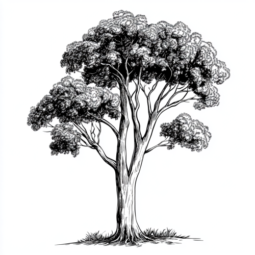 An Australian Jarrah tree with a thick, wide, straight trunk, featuring simple woodcut-style shading. The trunk is stirdy, especially its base. The tree and its branches are symmetrical. Use highlights and shadows to create depth and a dramatic contrast, in the style of vintage barbershop. The background should be completely white, with the tree in a monochromatic, high-contrast, linocut or engraving style suitable for a vector illustration for a logo.
