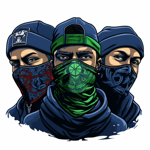 gang street logo green and blue, transparent background, 3 gang member heads, one is wearing a bandana mask,