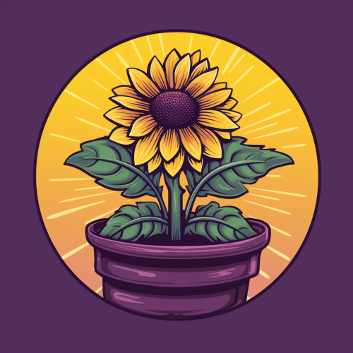 a logo for a garden centre, a potted plant , in the shape of sunflower, at purple sunset