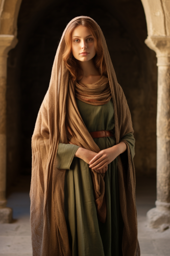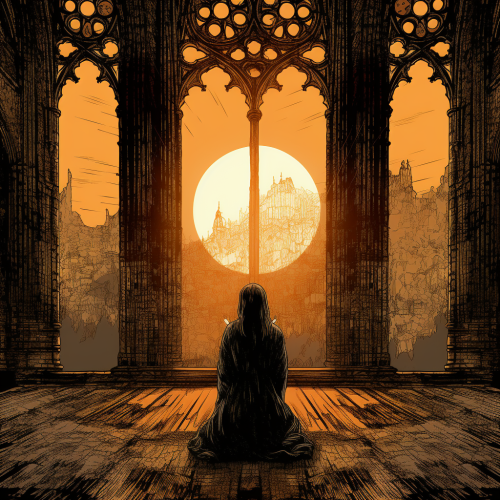 a woodcut illustration of a young woman with a simple dress wich shows her shoulders sitting on the floor in a gothic stone hall, symmetrical perspective in a medieval setting, the scene is lightened by evening sun through huge glass windows