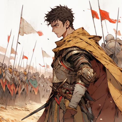 Illustration, 25 year old king, short black hair, grey eyes, tan skin, skinny, scar running across his face, 11th - century scale armour and gold cloak, standing on the battlefield --niji
