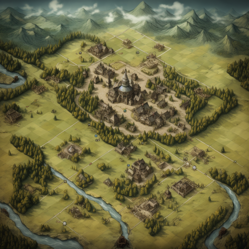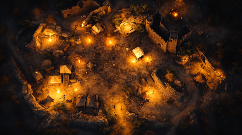 a top down view of a bandit camp placed outside of a castle fort, its night time and the area is lit by fires and flame torches, a battle map for dungeons and dragons, huge space, --ar 16:9