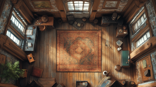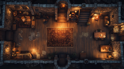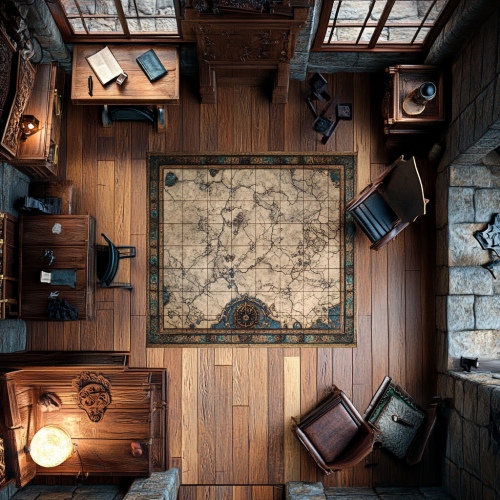 a birds eye view battle map for dungeons and dragons, the map is off an old castle office with wooden floors, a desk, an animal rug, and various bits that would be found in a castle are there