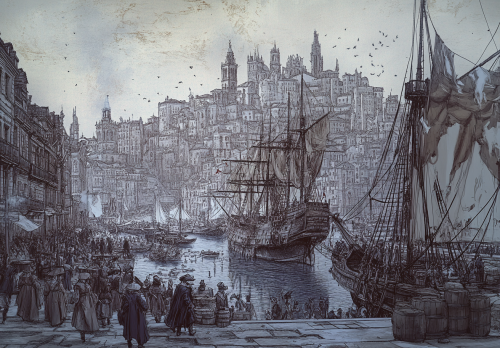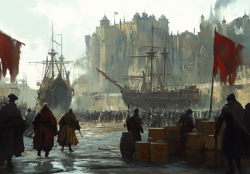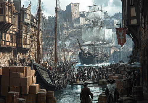 An illustration by fantasy artist Raphael Lacoste of the busy docks of 1580 Bilbao, Spain, with medieval buildings crowding the docks. In the background are more medieval buildings of Bilbao which crowd each other, and also the ship, a caravel and a galleon are berthed. The foreground has two mysterious pirates the picture walking past many dock workers carrying boxes and barrels. The mood is grim and the people are miserable, with this being the theme of the picture. It is a sunny spring day but the scene is still grimy and dirty, 8k, HD, insanely detailed and intricate, elegant, hyper realistic, fantasy theme. super detailed --ar 13:9