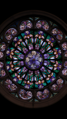 A gothic stained glass rose window with intricate, edgy details in darker pastel shades like muted lavender, dusty rose, and soft grey. The transparent sections allow light to pierce through the darker colors, giving the design a haunting, almost mystical atmosphere while still retaining the elegance of traditional medieval windows. --ar 9:16 --v 5.0