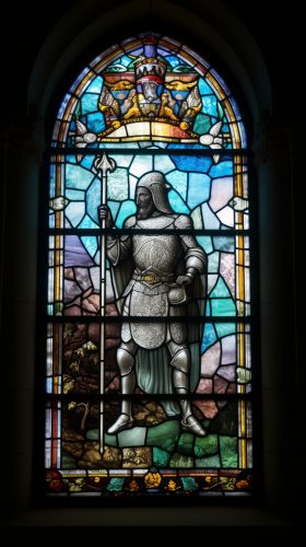 A medieval stained glass window depicting a knight holding a shield, with intricate designs in pastel colors like light lavender, soft gold, and pale blue. The transparent glass sections create realistic light effects, giving the knight’s armor and shield a glowing appearance. The design combines medieval themes of valor with a fresh, modern pastel color palette. --ar 9:16 --v 5.0
