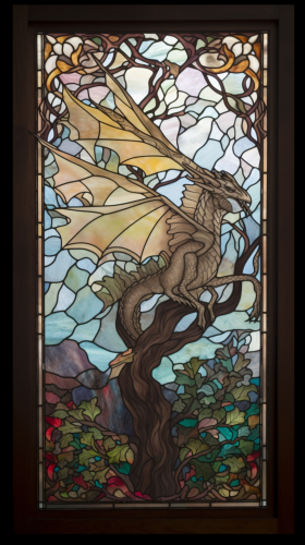 A stained glass mosaic of a medieval dragon flying over a forest, depicted in pastel colors. The transparent glass areas give the dragon a luminous, otherworldly appearance, with light streaming through the wings and surrounding environment. The design feels like a mix of medieval fantasy and modern softness. --ar 9:16 --v 5.0