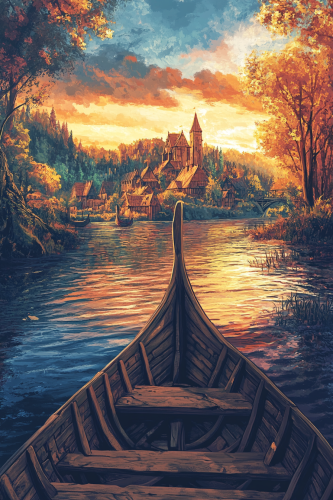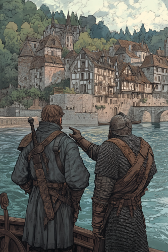 detailed graphic novel style, Alphonse Mucha color style, a medieval riverboat sailor and a warrior in chainmail armor stand next to each other on a riverboat, the riverboat is approaching the docks on an island in a wide river, behind the docks are gray stone buildings, a town is visible on the river bank behind the island, all buildings are two floors or less, a forest is visble to the side of the river, the sailor and warrior are facing the docks, the sailor is pointing to the docks showing where the riverboat will berth, low-angle shot from behind the sailor and warrior, --ar 2:3
