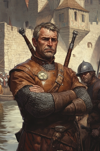 medieval fantasy, graphic novel style, a middle-aged town guard sergeant waits on the river docks with folded arms, he is wearing chainmail armor and has a spear strapped to his back, the sergeant has a serious expression, behind the sergeant and the docks are stevedores loading goods into a low stone warehouse, --ar 2:3