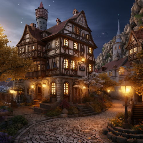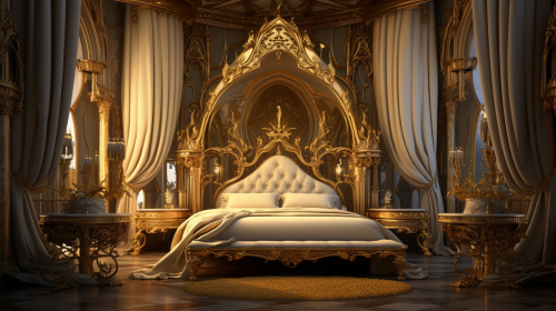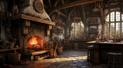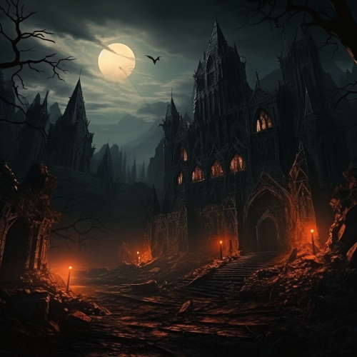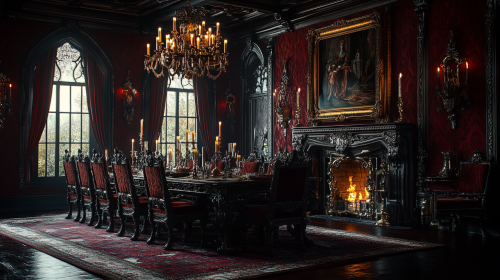 Capture a Western Gothic home decor setting in a lavish dining room, where deep crimson walls are paired with a dark mahogany dining table. Ornate, gilded candle holders atop the table cast a warm, flickering light, reflecting off polished silverware. Heavy velvet drapes frame tall, arched windows, enhancing the room's medieval charm. A grand fireplace with intricate carvings serves as the backdrop, with a large tapestry hanging above it depicting an ancient Gothic tale. This scene should convey a sense of regal decadence, inviting viewers to explore a space steeped in luxurious mystery. Camera: DSLR - Canon EOS 5D Mark IV. Lens: Canon EF 24-70mm f/2.8L II USM. Composition: Wide shot, room-centered, horizontal orientation, balance between furniture and space. Film: Digital, high resolution, color profile sRGB. Camera settings: ISO 400, f/2.8, 1/60 sec. --ar 16:9 --v 6.1 --s 250