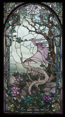 A stained glass mosaic of a medieval dragon flying over a forest, depicted in pastel colors like light mint, pale pink, and soft purple. The transparent glass areas give the dragon a luminous, otherworldly appearance, with light streaming through the wings and surrounding environment. The design feels like a mix of medieval fantasy and modern softness. --ar 9:16 --v 5.0