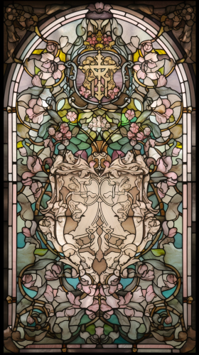 A royal crest design rendered in stained glass, with intricate heraldic symbols in soft pastel shades of light pink, pale yellow, and mint green. Transparent glass areas give the crest a glowing, regal effect as light passes through, casting delicate reflections. The design is medieval yet modern, with the soft colors softening the traditional crest. --ar 9:16 --v 5.0