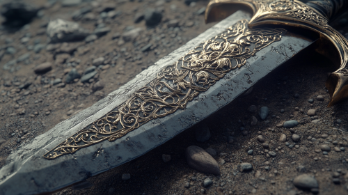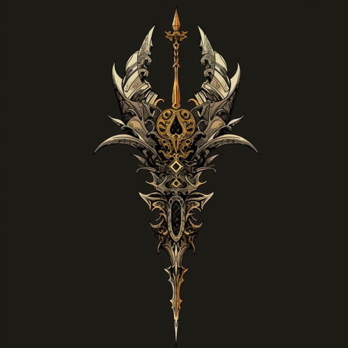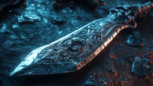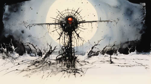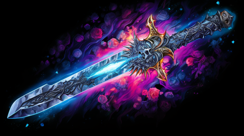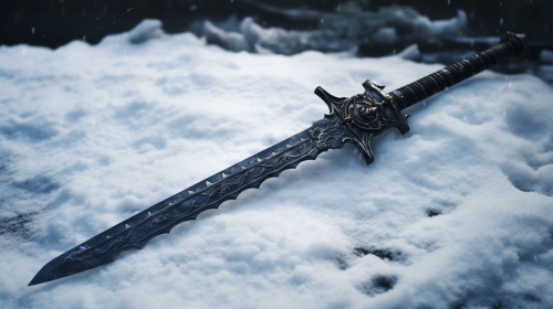 by Ralph Steadman, Ultra-HD, two-handed sword made of unknown black metal, sword name Dark Bite of Winter --uplight --ar 16:9
