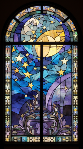 A medieval-style stained glass design of a moon and stars, rendered in pastel tones such as soft lavender, pale yellow, and sky blue. The transparent sections give the night sky a glowing, luminous effect, as if light is radiating from the stars themselves. The design is both celestial and medieval, with a modern twist through the use of soft pastel colors. --ar 9:16 --v 5.0