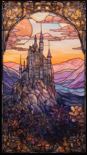 A stained glass window depicting a medieval castle perched on a hill, with surrounding landscapes and skies in pastel colors such as light lavender, sky blue, and soft peach. The transparent glass gives the scene a magical, dream-like quality, with light casting realistic reflections through the design. The details of the castle are medieval in style, softened by the gentle pastel palette. --ar 9:16 --v 5.0
