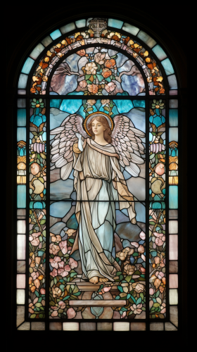 A medieval-inspired stained glass window featuring an angel and doves, rendered in soft pastel tones of pale yellow, blush pink, and light blue. Transparent glass sections allow for realistic light diffusion, creating an ethereal glow around the angelic figure. The design is detailed and graceful, combining medieval religious themes with a modern, peaceful color palette. --ar 9:16 --v 5.0