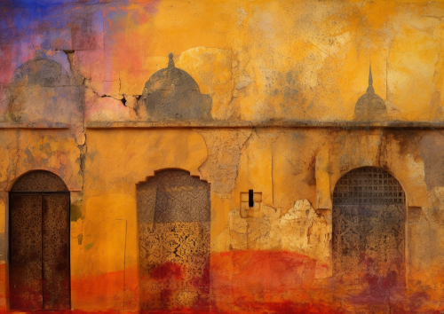 abstract grunge, close facade Rabatt africa, medieval,, dawn, inspired by Mordecai Ardon and Odilon Redon and Pierre Bonnard and Edouard Vuillard and Otake Chikuha and Dexter and Francis Hodgkin’s, no text, no watermark, no signature, no copyright --v 5.0 --ar 14:10 --no borders, frames, split frames