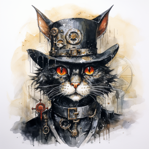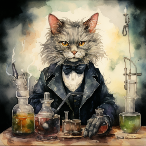 anthropomorphic cat 10 year old mad scientist google black fur watercolor medieval fantastic