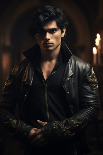 attractive young male with golden skin, black devil horns and lushious black hair wearing dark leather in a midieval castle, ultra realistic, ultra detailed, 4k, --v 5.2 --ar 2:3
