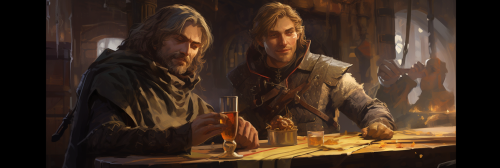 a young and tall northern male barbarian with fair skin and blonde hair, beard and a broad smile is drinking wine with a small, slim and young mysterious male thief with dark hair and dark skin in a grey coat, they are sitting on a bar in the tavern "the silver eel" in lankhmar, best friends, fritz leiber, newhon, fantasy illustration --ar 3:1