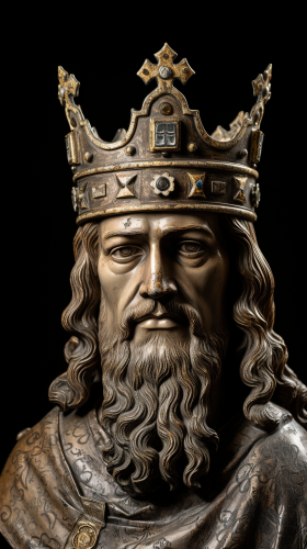 Photography of Charlemagne, battle-hardened, charismatic, Frankish descent, towering presence, piercing blue eyes, kingly dominance, long flowing blond hair, fair Caucasian skin, robust build, 8th to 9th-century royal attire, crown, royal cloak, reign over Franks and Lombards, foundational role in Carolingian Empire, Nikon D850 with an 85mm f/1.4 lens, --ar 9:16 --s 200