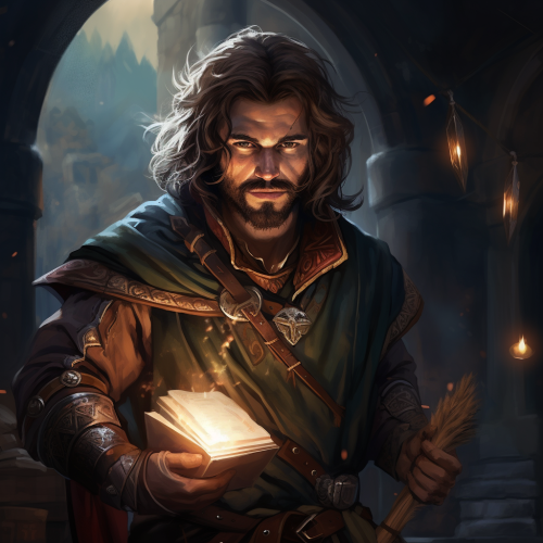 *cinematic full body shot, dungeons and dragons character art style, male, halfing, hobbit, beautifully crafted long bow in hand, quiver of arrows on back, brown hair, stubby nose, thick eye brows, glowing white book hanging from waist