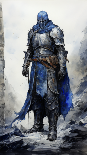 dark fantasy, concept art, watercolor and pen and ink, cleric in chainmail armor, blue tabard, dark battlefield background, detailed --ar 9:16