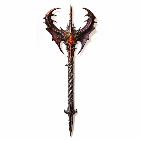 An elegant lance is adorned with dragon motifs and has a sharp, barbed tip resembling a dragon's fang. The shaft is made of dark, polished wood with draconic runes etched along its length. Has a white background. Drawn in Dungeons and Dragons 5th edition art style.