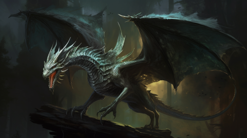Capture the enigmatic presence of a wyvern, its formidable form veiled in an ethereal dance of shadowy smoke, standing amidst the echoing silence of a darkened forest, illuminated only by the haunting glow of moonlight. The creature’s scaled body, powerful wings, serpentine tail with a venomous stinger, and dragon-like head are half-hidden, half-revealed, offering a glimpse of terror and beauty intertwined. Medium: Digital art in a DND medieval fantasy style. Style: Inspired by the intricate detailing of classic D&D handbooks, infused with the ethereal and ominous aesthetic reminiscent of the works of artists like Alan Lee and John Howe. Lighting: The scene is dimly lit, with the moon’s tender light casting enigmatic shadows that dance with the wyvern’s shadowy smoke, creating an atmosphere of haunting mystery. Colors: A palette dominated by deep blacks, shadowy greys, and moonlit silvers, punctuated by the ominous glow of the wyvern’s eyes and the ethereal shimmer of the smoke that veils it. Composition: Envisioned as a detailed illustration in a medieval grimoire, where the wyvern emerges as a spectral menace, a dance of shadows and light that captures the soul with both terror and awe. --ar 16:9 --v 5.1 --style raw --s 750