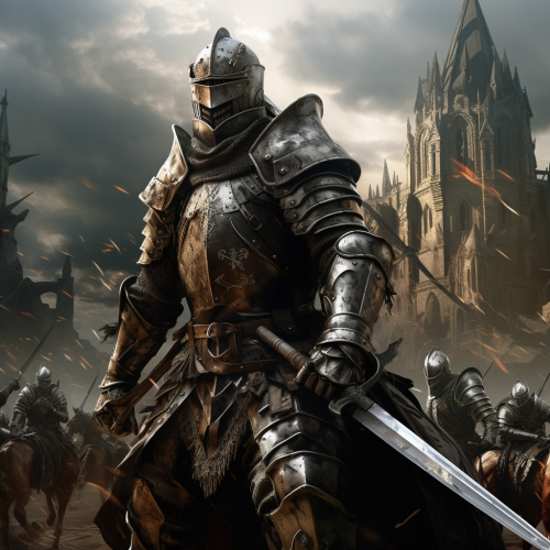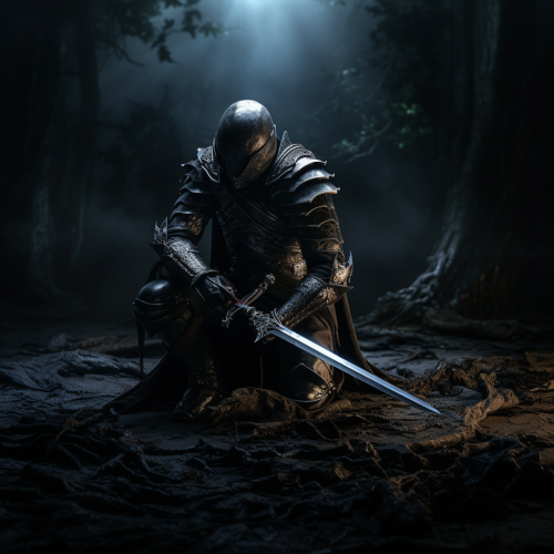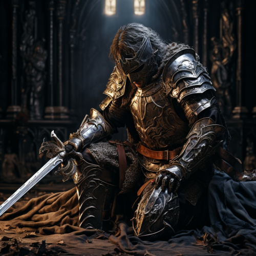 a kneeling medieval knight in shining armor holding a sword, clad in armor forged from the elements, strong, wise --s 250